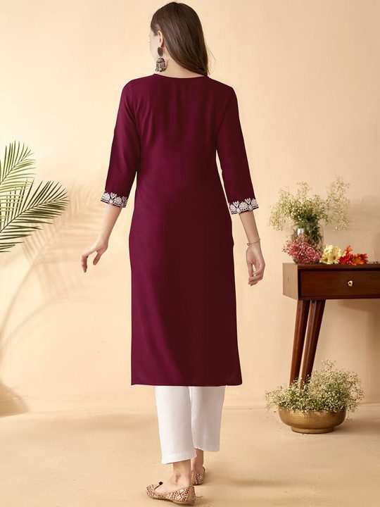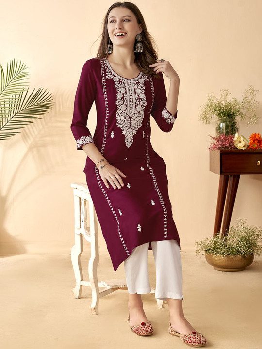 Maroon Ethnic Motifs Embroidered Round Neck Thread Work Straight Kurta