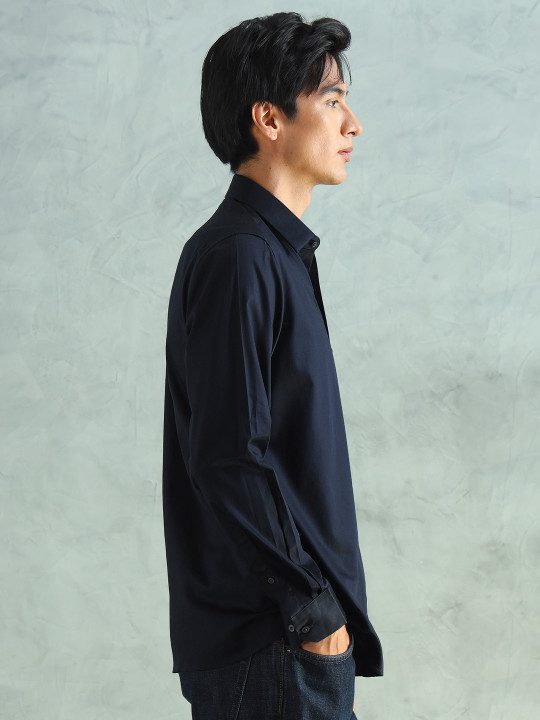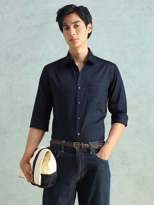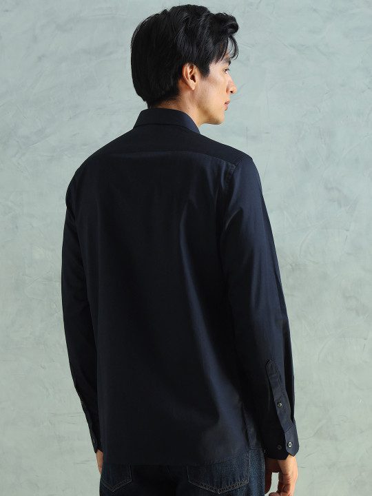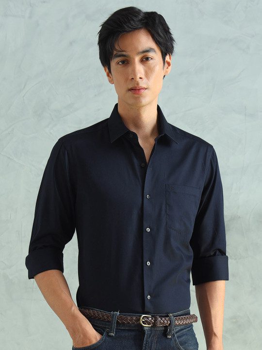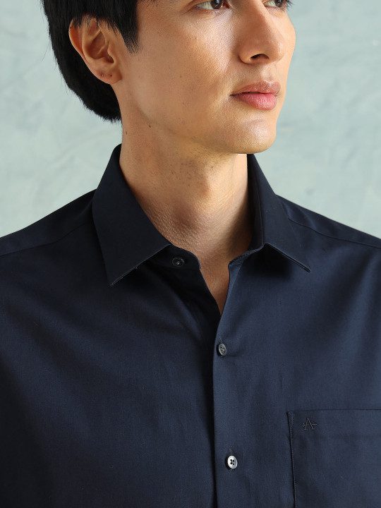 Navy blue solid opaque formal shirt, has a cutaway collar, button placket, 1 patch pocket, long regular sleeves, curved hem
