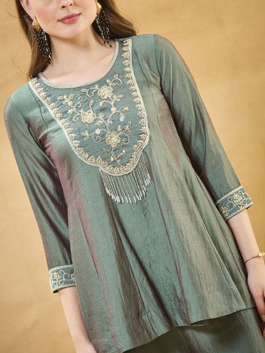 Colors of Earth Women Ethnic Motifs Embroidered Empire Thread Work Pure Silk Kurta with Palazzos & With