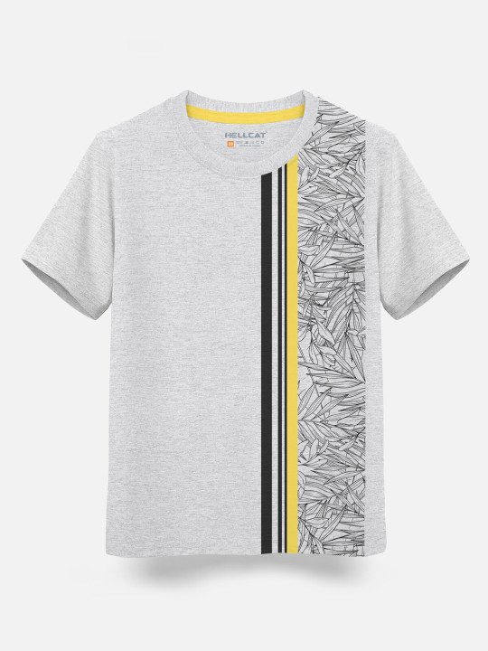 Grey melange, black and yellow, graphic printed,has regular length, has round neck, short, regular sleeves, knitted cotton fabric