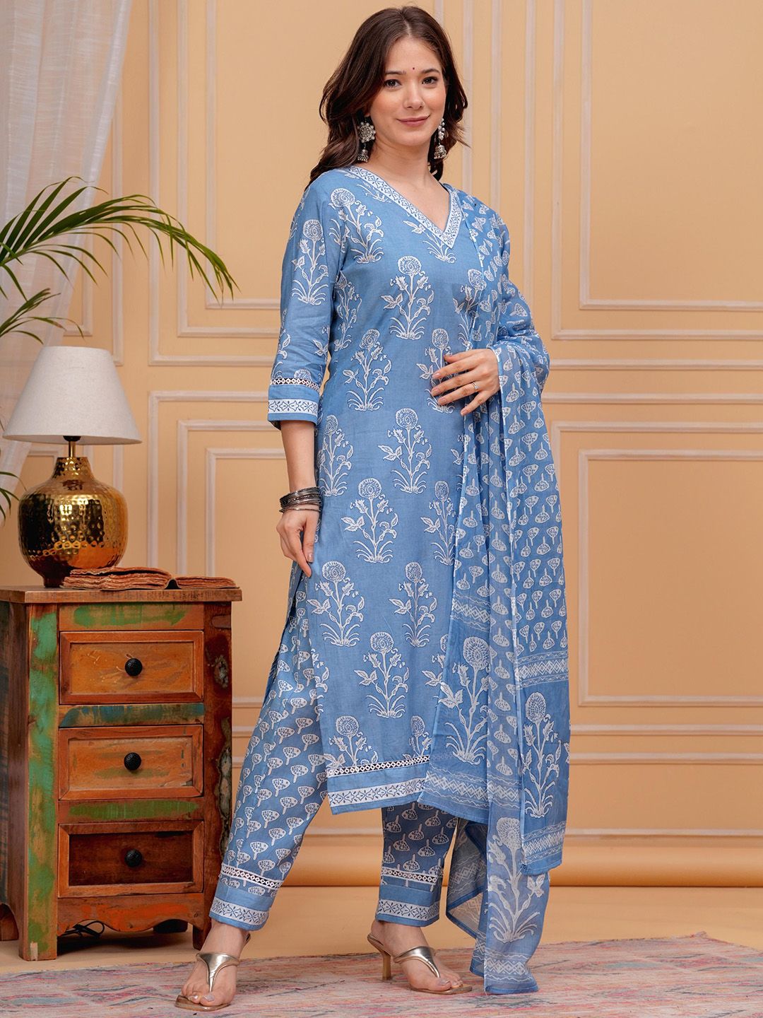 Floral Printed V-Neck Pure Cotton Kurta With Trousers & Dupatta