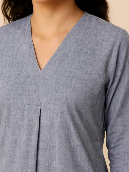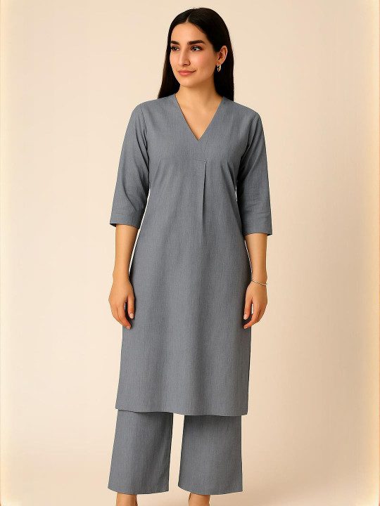 GREYISH-BLUE SOLID KURTA SET MINIMALIST V-NECK KURTA WITH 3/4TH SLEEVES, PAIRED WITH MATCHING WIDE-LEG BOTTOMS. MADE FROM SOFT, BREATHABLE FABRIC FOR ALL-DAY COMFORT. SUITABLE FOR CASUAL AND SEMI-FORMAL WEAR.