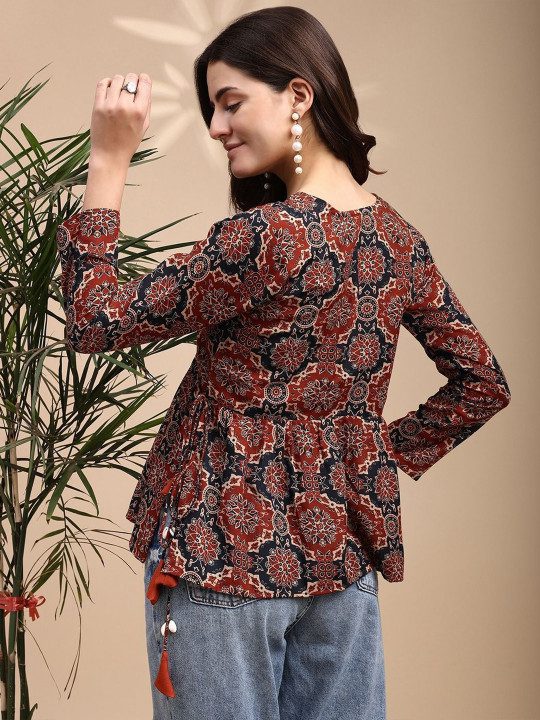 Women Ajrak Print Alia cut Peplum Kurti With Tassles and Kodi