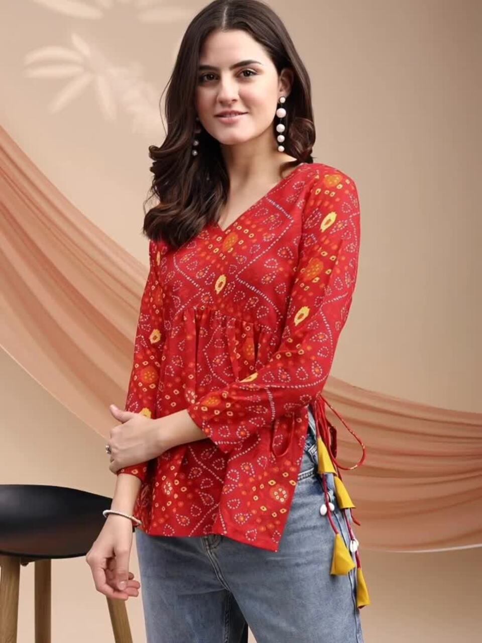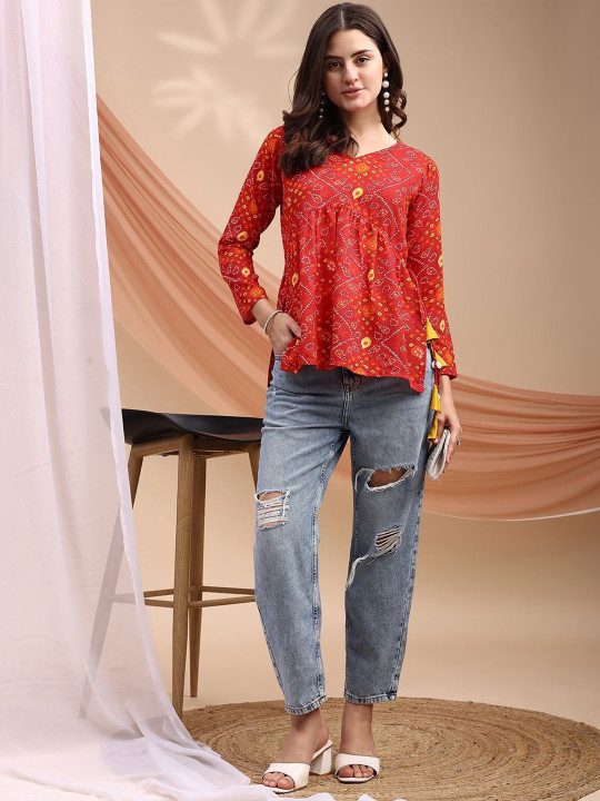 Women Bandhani Print Peplum Kurti With Tassles and Kodi